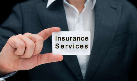 Man's hand showing business card with inscription Insurance Services