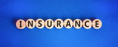 Insurance symbol. Concept words Insurance on beautiful wooden circles. Beautiful blue background. Business support medical insurance concept. Copy space.