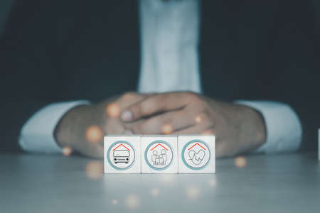 Businessman showing choice of insurance for life protecting family car and life. The concept of insurance.