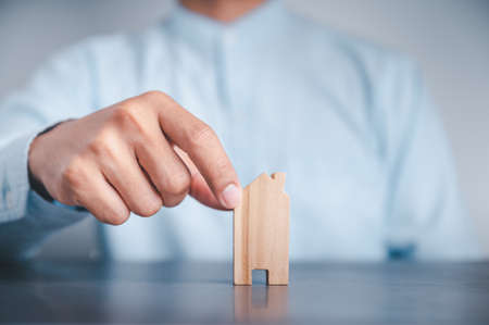 Close up hand choosing mini wood house model from a row model. Choose what's the best. A symbol for construction ,ecology, loan concepts.