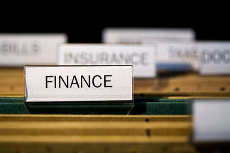 view inside filing cabinet with brown file folders, green folder with finance label in focus