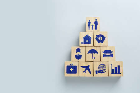 Wooden Blocks with Words House Insurance. Business Insurances business Concept to get coverage for Life, Home, Car, Travel, Medical and Dental, Personal Accident