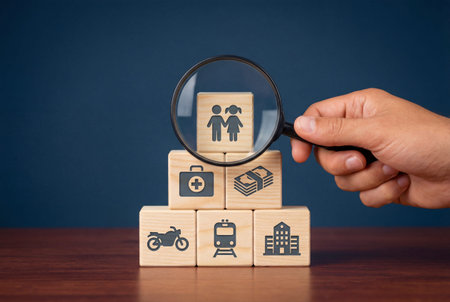 Hand holds magnifying glass over pyramid of wooden blocks symbolizing family, health, money, travel, education and home security concepts on wooden surface highlighting protection and well being priorities