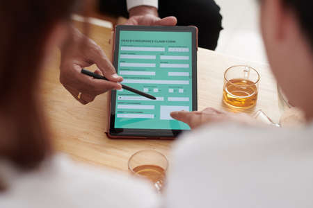 Insurance agent giving tablet computer with insurance claim form to family and asking to fill personal data