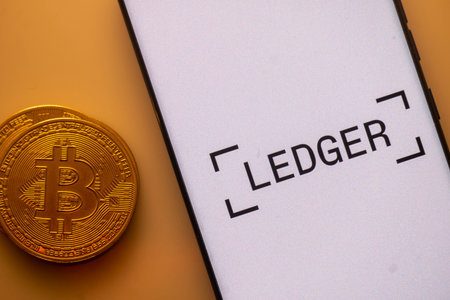 Dhaka, Bangladesh 22 September 2025:Bitcoin displayed next to a smartphone with Ledger app interface on white background