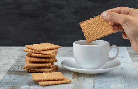 A cup of aroma tea with crackers on a wooden table