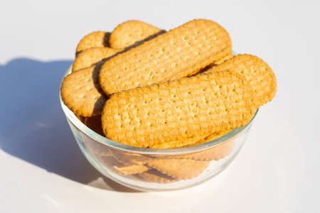Biscuits in glass bowl on white background.