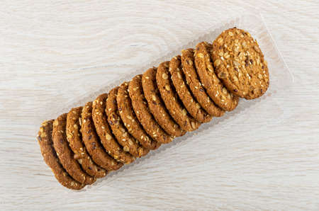 top view of sweet cookies in a plastic packet on wooden table