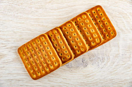 A pile of golden brown biscuits on a wooden background