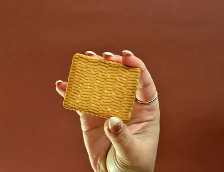 woman hand holding piece of biscuit.