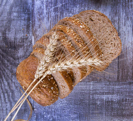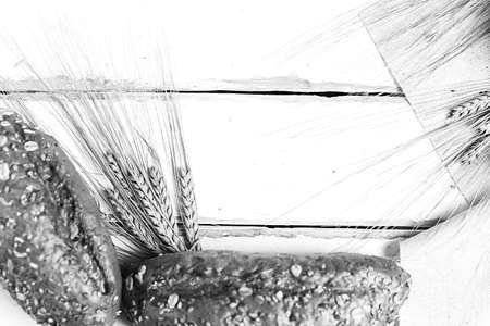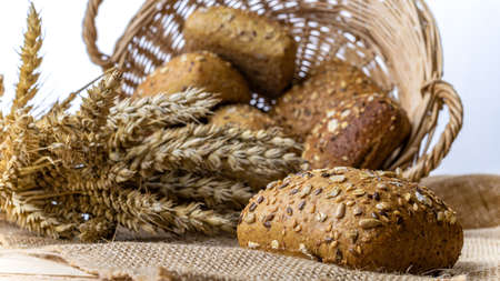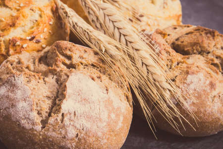 Fresh wholegrain rolls with seeds and ears of rye or wheat grain. Vintage photo