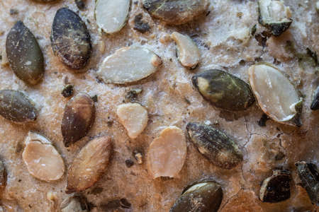 Healthy whole grain dark bread with seeds on black. Copy space. Close up