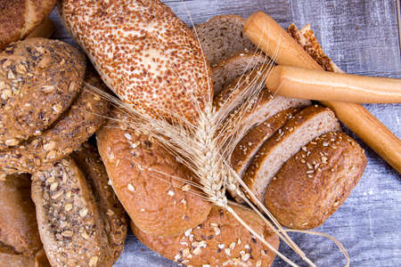 Top view of various kinds of bread on a wooden surface. Close up Concept of homemade bread, small bakery, natural farm products, local food, domestic production. Healthy and tasty organic food.