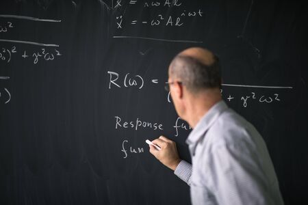 Math teacher drawing fuction graph on a blackboard during mathclass (shallow DOF, color toned image)