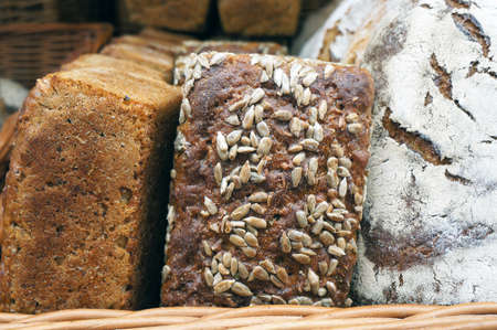 Loaf of rye bread with sunflower seeds in wicker basket.