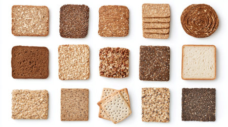 A visually appealing arrangement of assorted bread types and baked goods presented on a clean background, showcasing texture and color diversity.