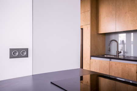 Modern kitchen with black countertop and wooden cupboard