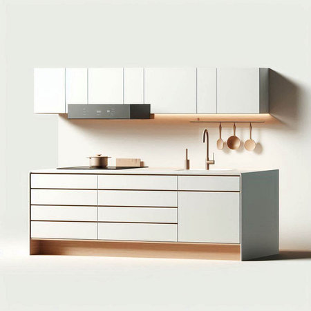 3d render of a modern kitchen with white walls and a built in sink