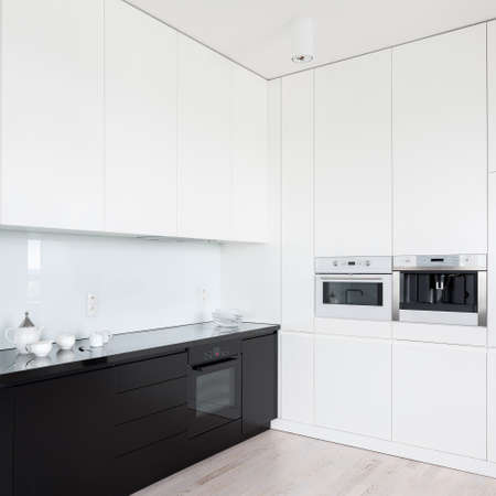 Modern and stylish kitchen interior with white walls and upper cupboards and black countertops, drawers and lower cupboards