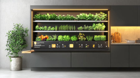 This image showcases a sleek vertical garden flourishing with various herbs and vegetables, ideal for modern kitchens seeking sustainable and fresh food solutions.