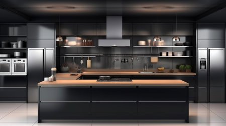 3d Illustration of modern black kitchen in a house with a beautiful design