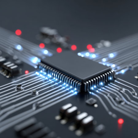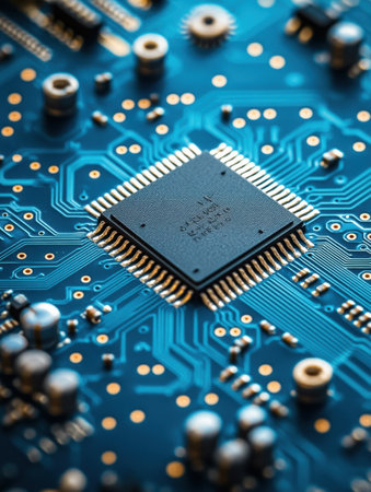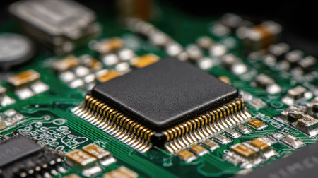 A close up of circuit board with microchips and electronic components showing detailed technology and automation in business and industry
