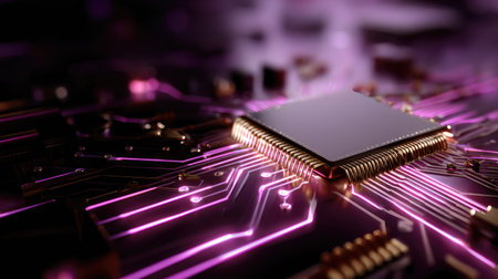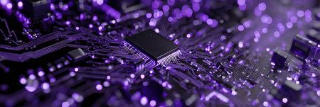 This image features a close-up view of a computer chip embedded in a complex circuit board, illuminated by vibrant purple light, showcasing technological innovation.