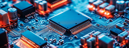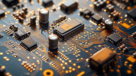 This image showcases a detailed view of a circuit board, featuring integrated microchips and processors. The composition highlights intricate circuitry and electronic components, with a shallow depth of field. Warm, orange highlights contrast with darker tones, suggesting a high-tech environment. Suitable for illustrations in technology, science, or commercial applications.