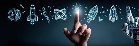 A hand reaches for a glowing point amid sketches of rockets, planets, and symbols of imagination and innovation.