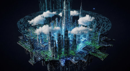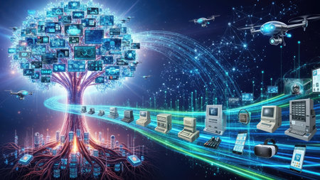 An image depicts a stylized tree comprised of screens, symbolizing digital technology. Glowing lines connect various devices like computers, phones, and drones. The composition showcases a vibrant color palette, with a focus on blues and greens, set against a dark background. It is suitable for illustrating concepts of innovation and networks.