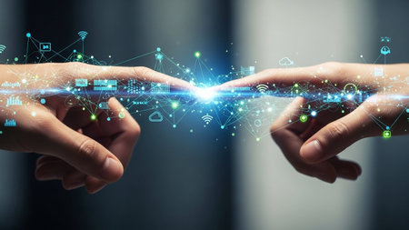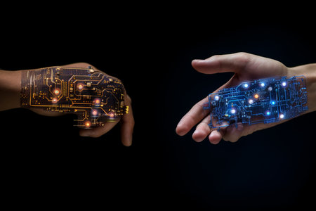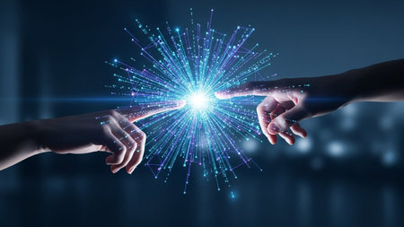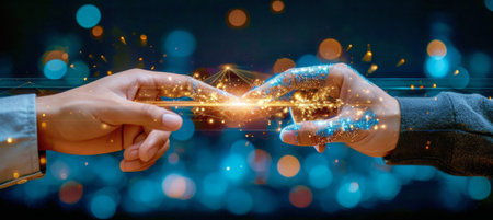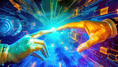 Human Hand and Robotic Hand Touch in Futuristic Sci-Fi Setting with Glowing Lights