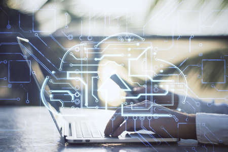 Double exposure of woman hands typing on computer and technology theme drawing. High Tech concept.