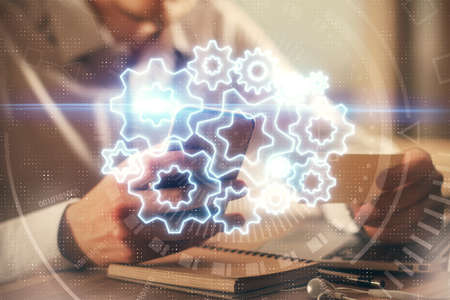 Double exposure of man's hand holding and using a digital device and brain hologram drawing. Data concept.