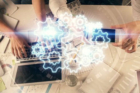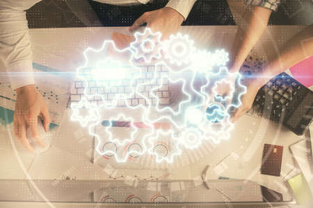 Double exposure of man and woman working together and business theme hologram drawing. Computer background. Top View.
