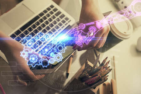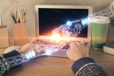 Double exposure of creative artificial Intelligence symbol with modern laptop on background. Neural networks and machine learning concept
