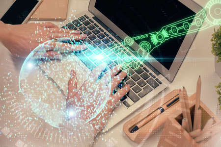Double exposure of woman hands working on computer and data theme hologram drawing. Tech concept.