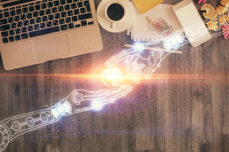 Multi exposure of data theme drawing hologram over topview work desk background with computer. Concept of technology.