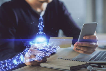 Double exposure of man's hands holding and using a mobile device and creative hologram drawing.
