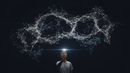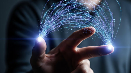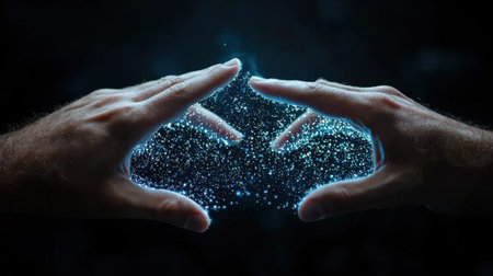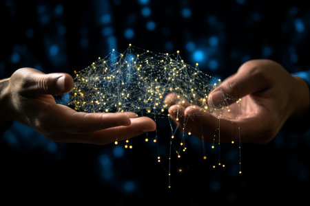 This captivating image features hands gracefully holding glowing digital network connections, showcasing the intersection of technology, data, and innovation in a mesmerizing dark setting.