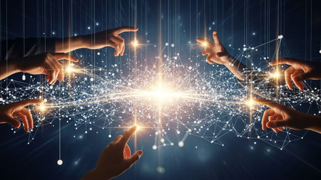 This image features human hands holding a vibrant explosion of digital particles and a colorful network, symbolizing innovation and the interconnectedness of ideas.