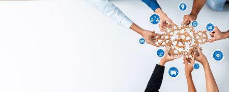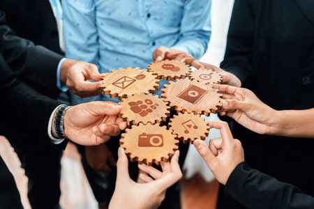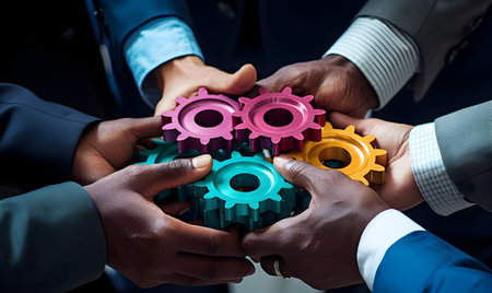 A diverse group of hands comes together to assemble interlocking gears, symbolizing collaboration and strategic planning in business management and teamwork efforts. Amity