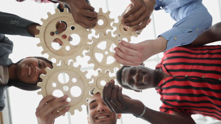 Group of multiracial people joining gear wheels together as metaphor for effective team collaboration, unity, teamwork, finding working solutions and creating business systems. From below, low angle