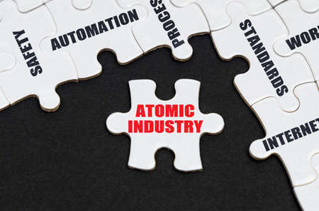 Industry concept. On a black background, puzzles with inscriptions, on a separate puzzle there is an inscription - Atomic industry