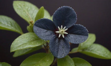 Close up of blue flower with water droplets on black background.