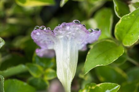 Purple flower with water droplets on the petals and green leaves