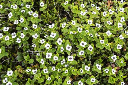 Carpet of blooming Swedish Derain on an island in the White sea, Russia
