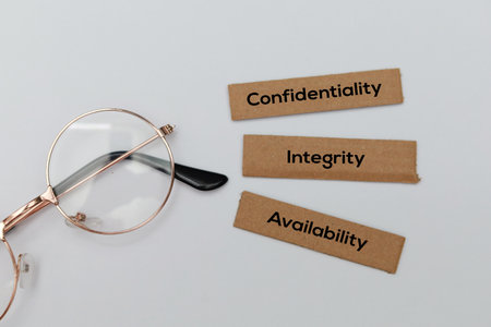 Concept of Key and confidentiality Integrity Availability - CIA write on sticky notes isolated on Wooden Table.