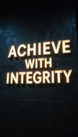 A striking photograph of a lighted sign featuring the motivational phrase Achieve With Integrity, ideal for modern business or personal development themes.