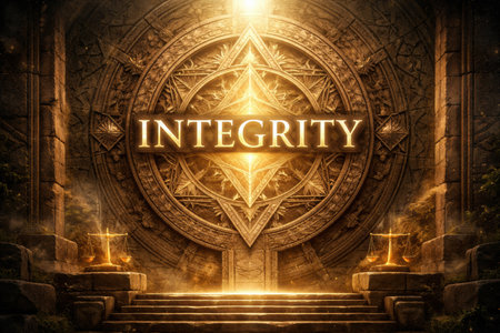 A bright light illuminates a stone wall that features the word Integrity with scales, creating a powerful scene that invites reflection.