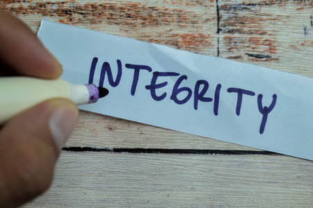 Concept of Integrity write on sticky notes isolated on Wooden Table.